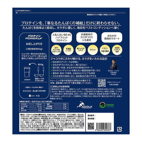 この栄誉ある受賞を機に、2025年創業20周年を迎える当社はさらなる社会の健康課題解決に貢献していくことを目指します。 ■ジャパンフードセレクションについて JUCOLAは、アスリートのニーズに沿った効率的なカラダづくりのための新しいタイプのプロテイン製品を目指し、素材の調査研究に着手。スポーツ栄養学の視点に立って開発を積み重ねた結果、多機能型プロテイン製品を上市するに至りました。それは、「栄養補給」と「機能性」を合わせ持つ、まさに「マルチフォース」プロテイン。ぜひ、これまでのプロテイン製品との違いを実感してください。 また、合成着色料、合成甘味料、合成香料、保存料は一切使用しておりません。また、本製品の大きな特徴としては、たんぱく質によるカラダづくりをサポートする、特許取得成分「HSP10(特許第5917450号)」の配合です。 ジャコラプロテイン製品のご愛用者様の健康生活をサポートする一環として、乳酸菌の配合を検討してまいりました。乳酸菌は菌種によって、また同じ菌種であっても菌株によって、健康に対する有用性が大きく異なる事が知られていますので、その選択が最も重要です。 JUCOLAのプロテインパワーは、たんぱく質をカラダに吸収させる為にもっとも適した成分をもとに開発したプロテインです。吸収の早いホエイたんぱくと、じっくりと吸収されるカゼインたんぱくを、人のカラダづくりに最適なバランス「ホエイ 60:カゼイン 40」にしました。このほか、「HSP 10(天然黒ショウガエキス)」と、吸収に必要不可欠な酵素やオリゴ糖、数種類のビタミンをプラスしました。 また、国内メーカーのリカバリープロテインよりはるかに上回るオーストラリアメーカーのリカバリープロテインのアミノ酸数値よりも、JUCOLAのプロテインパワーは大幅に上回るアミノ酸数値を示しました。 プロテイン POWERの4つの大きな特徴をご紹介します。 「ホエイたんぱく」は吸収性に優れ、筋たんぱく質の構成必須アミノ酸の約35%を占めるBCAA含有が多いという特徴があり、市場の多くは「ホエイ100%」のプロテイン製品です。しかし、「ホエイたんぱく」は吸収が速いという利点がある反面、持続性がありません。一方、「カゼインたんぱく」は吸収が緩やかで、筋タンパク質にとって重要なグルタミンが多いという特徴があります。 JUCOLAは「ホエイたんぱく」と「カゼインたんぱく」を60:40の比率で配合することで、「ホエイたんぱく」の欠点を補い、「スピードチャージ」と「タイムリリース」の特性を持つハイブリッドなプロテイン製品を実現しました。 また、60:40は人乳のたんぱく構成比に近く、人のカラダづくりにはこの自然がつくりあげた構成比が最良であると考えています。 JUCOLAのプロテインパワーは、摂取した「たんぱく質」が効率よくカラダ作りに利用されるよう設計されており、その一つが産学協同開発によって生まれた新素材「黒ショウガエキスHSP10」(特許第5917450号)の配合です。 この他、JUCOLAのプロテインパワーには、カラダづくりにとって重要な体内環境を整える有用成分も配合されています。 黒ショウガエキス HSP10とは 黒ショウガ(ウコン)にはポリフェノールの一種であるメトキシフラボンが10種類含まれており、分子構造にOH基を有する4種類のメトキシフラボンの高純度ミックス品をHSP10と呼んでいます。原料である黒ショウガ(ウコン)に含まれるHSP10の含有量は僅かで、たいへん希少な成分です。 ● 5種類の酵素 体内酵素はカラダづくりや健康維持に欠かせません。体内で作られるものと食物由来があります。穀物発酵エキスには栄養素をサポートする5種類の酵素が含まれています。乳中の乳糖が気になる方にも安心です。 ● 水溶性の食物繊維「イヌリン」 チコリ根由来の天然イヌリンは、オリゴ糖と食物繊維の性質を合わせ持ち、カラダづくりに大切な体内環境をサポートします。また、カルシウムなどのミネラルの利用をサポートすることが知られています。 ● グリシン アミノ酸「グリシン」で休息をサポート!休息アミノ酸として有名なグリシン。質の高い休息はカラダづくりに欠かせません。また、筋肉エネルギー源の「クレアチン」や体内の重要成分「グルタチオン」の体内原料でもあり、乳たんぱく中の含量は多くありません。 カルシウムやマグネシウムなどのミネラルも補給! JUCOLAは、安全性に関して3つの強いこだわりを持っています。 ● 天然甘味料「ステビア」を使用。 JUCOLA製品に使用している天然甘味料「ステビア」は、甘味成分であるステビオール配糖体の中で最高品質といわれる「レバウディオサイドA」を95%以上含むハイグレード品で、安全性に関し、厚生省規格はもとより国際規格「JECFA規格」やFDA「GRAS規格」の基準に適合しています。 ※JECFA:国際FAO/WHO合同食品添加物 専門家会議 ※FDA:米国食品医薬品局 ※GRAS:一般に安全であると認められる ※ステビア:南米産のキク科ステビア属多年草(学名:Stevia rebaudiana) ジャコラの